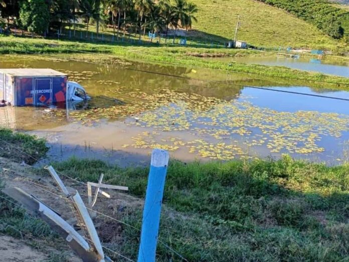 O caminhão saiu da pista, colidindo com uma cerca de eucalipto e um poste de concreto, ambos danific...