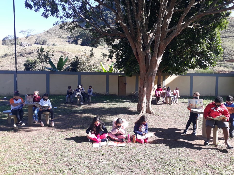 Todos os dias letivos, durante o recreio, a escola promove o incentivo à leitura junto aos estudante...