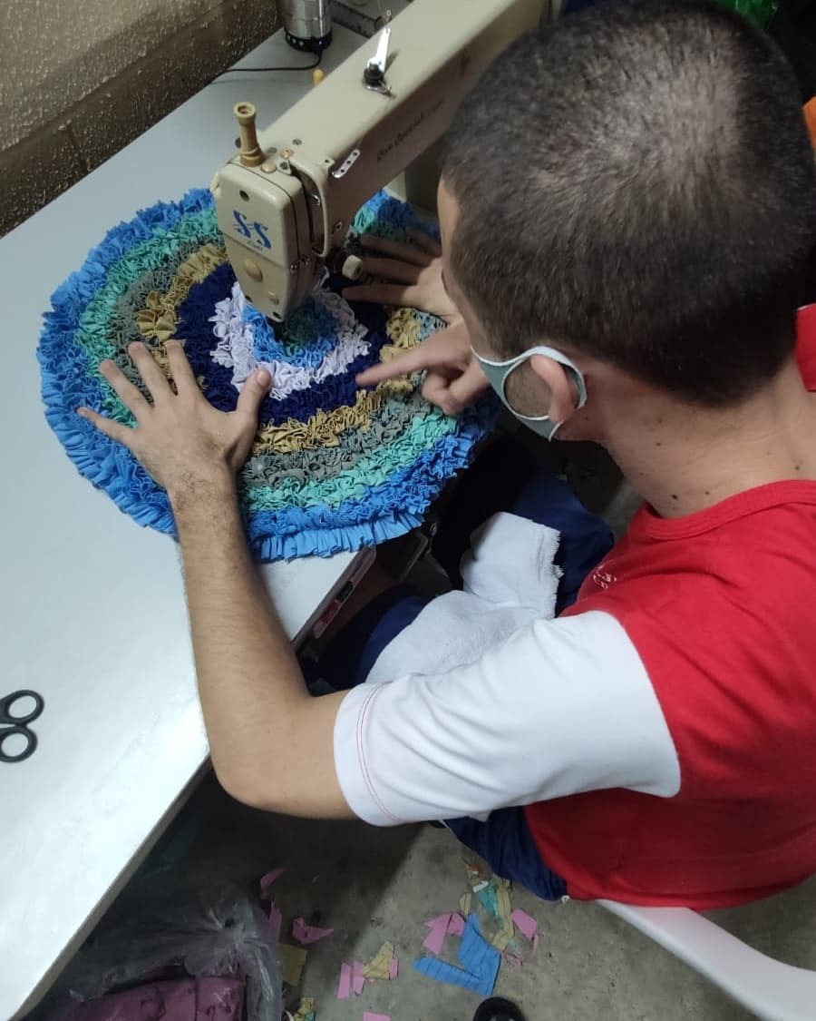 Na oficina de costura, o conhecimento é compartilhado entre os internos...