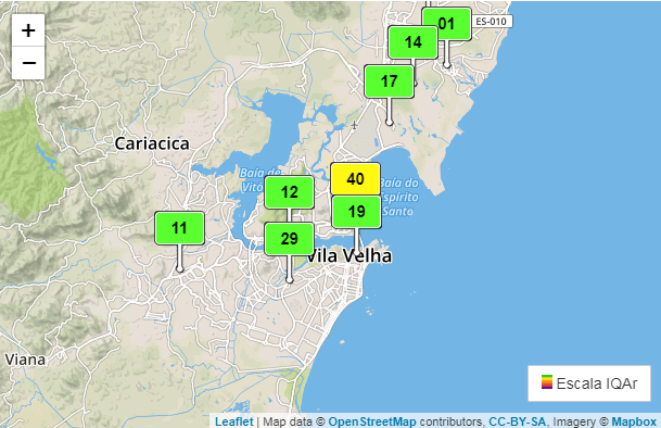 No mapa, a qualidade do ar pode ser classificada em cinco parâmetros (boa, moderada, ruim, muito rui...