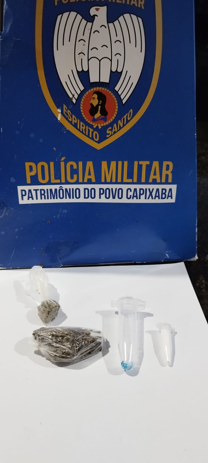 Na busca pessoal, foram encontrados em sua posse um pino de cocaína e dois pedaços de maconha (Crédito: PMES)
