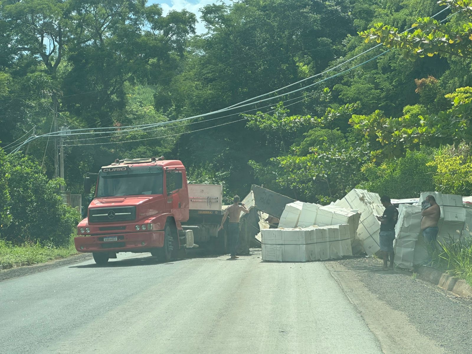 Segundo a Polícia Militar, o caminhoneiro trafegava no sentido Itarana x Colatina quando perdeu o controle em uma curva, fazendo com que parte da carga invadisse a contramão. Com isso, o motorista do carro foi forçado a sair da pista, colidindo contra a carga e o barranco, capotando em seguida. Em decorrência do acidente, os cinco ocupantes do carro ficaram feridos e foram atendidos pelo Samu/192.