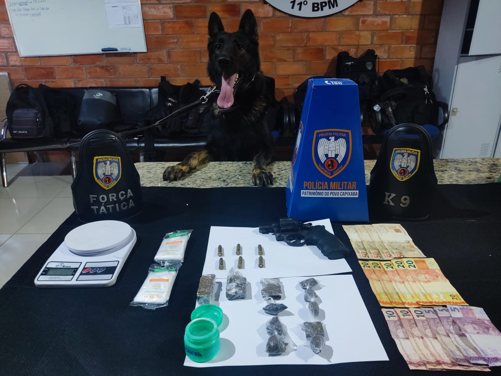 Com o auxílio da cadela Athena, especializada em detecção de armas e drogas, foram localizados um re...