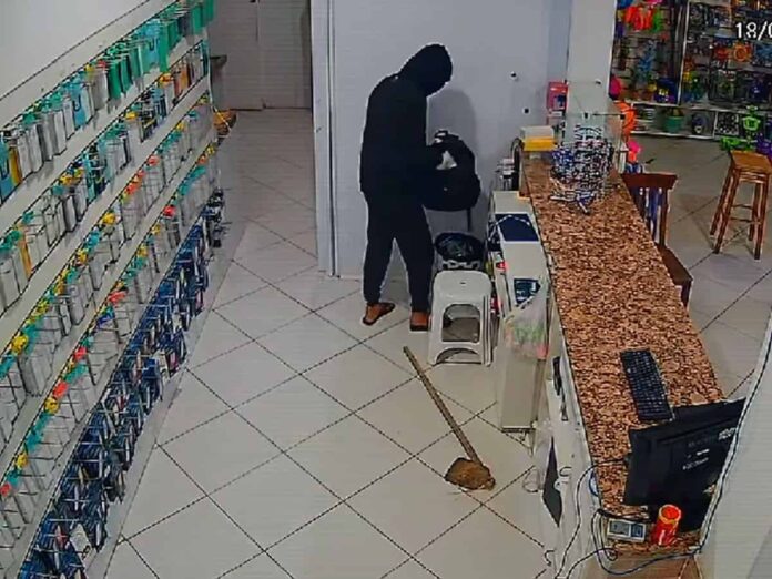 O criminoso utilizou um enxadão para quebrar o vidro da loja e acessar o interior do estabelecimento...